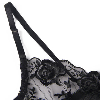 SUBBLIME - SET OF 3 PIECES BRA + THONG + GARTER FLORAL PRINT BLACK L/XL